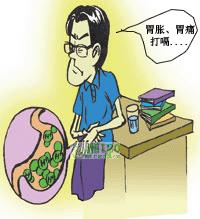 1、肝胃不和:胃脘部胀痛,嗳气打嗝,食后明显,遇情志不畅时加重。肝虞不能正常疏泄,横逆犯胃,胃气上逆。