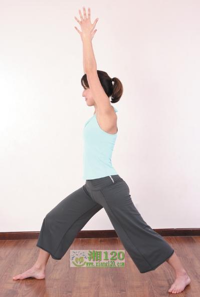 吸气,左脚脚后跟转动落地,踩实地面,向前大约45度;保持前腿弯曲90度,抬起上半身,双手伸过头顶;骨盆正对前方,脊椎向上伸展。