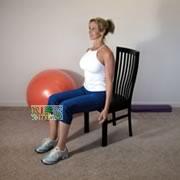 如图所示,坐在椅子的边缘,吸气,将肩部向耳部上体。将肩部后转,将肩胛骨收缩在一起。