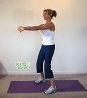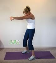 双腿站立,双脚之间的距离略比肩宽,曲膝,将肚脐吸向脊椎。十指交叉,将将双臂放到略比肩部低的地方。呼气的时候,将双手向前推,低头含胸。保持这个姿势,呼吸5次。休息。重复整个过程3次。
