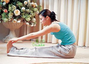 坐姿,双腿伸直,脚后跟紧紧地相互靠拢。双臂提至头上方,先用右手将左臂拉长,然后用左手将右臂拉长。从髋部开始将上身挺直地向前弯下,用双手抓大脚趾,用力按紧,深吸气和呼气1-2分钟。