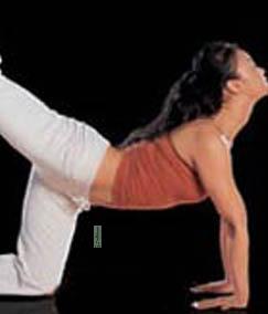 收腰腹作用:伸展强壮脊椎神经和坐骨神经,减少腰部、髋部、大腿区域的脂肪,强壮生殖器官,尤其适合女性练习。双腿屈膝跪地,双手支撑地面,双臂伸直,身体成四边形,翻转手腕,手臂内侧向前。吸气,抬头、展胸,右腿向后上抬。呼气,将右腿膝盖向腹部回收,低头。头与膝盖在腹部下方交触。反复4~6次。换左腿练习。