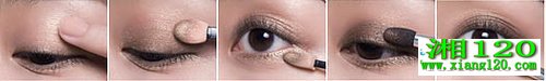 1、用肤金色珠光眼影打整个上眼皮和下眼睑。