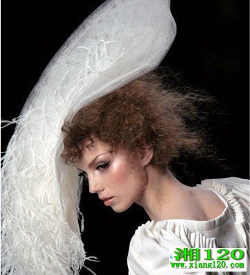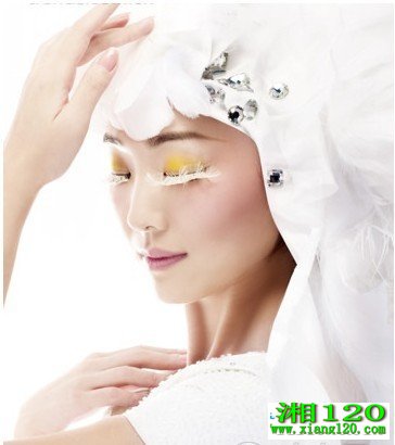 夸张感羽毛头饰VS眼部高光:为了不让夸张的羽毛头饰盖掉新娘的美丽,新娘妆部分要特别突出脸颊部的高光感和上扬眼线。用高光粉沿颧骨向发髻处轻扫,并在内眼角和眉骨处打造五官的立体感。眼影也呼应面部闪亮的效果选择珠光感强的眼影,不要忘记粘上浓密的假睫毛!