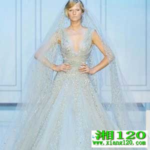 先来看看唯美梦幻的2011秋冬艾莉·萨博 (Elie Saab) 高级定制秀场。超模托妮·伽姆 (Toni Garrn) 以一袭冰蓝色礼服搭配曳地头纱,为这场冰清玉洁的大秀画上一个完美的句号,中场时超模卡莉·克劳斯 (Karlie Kloss) 演绎的深V领白色礼服搭配薄纱披肩,也是非常有“婚纱”气质的一个礼服造型。而一系列白色、裸色、冰蓝色的礼服,每一件都在极尽精致的,充满了纯洁美好的感觉。