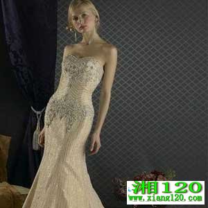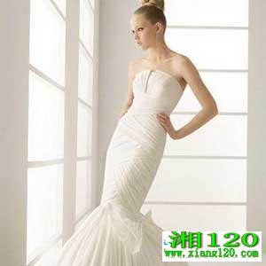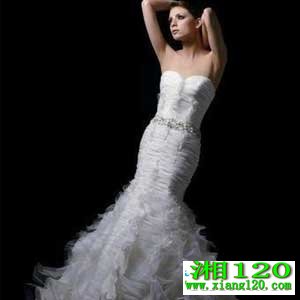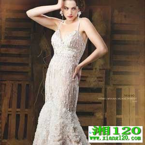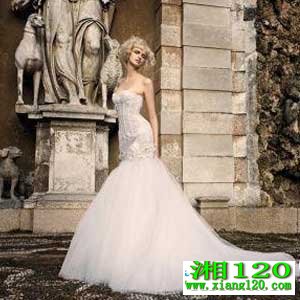 超越时间和时代的婚纱,如有人鱼公主一样优雅的魅力。鱼尾裙又称鞘形裙;裙宽与肩宽等同。依身体曲线裁剪,它的外轮廓接近与人身体的外轮廓,即使人体被完全覆盖,也能显露人体体形。因为贴紧人体,不用衬裙,裙摆下端可以随意设计成美人鱼式。一定要搭配一双高跟鞋,这样的完整呈现,才会光芒四射,艳冠群芳。