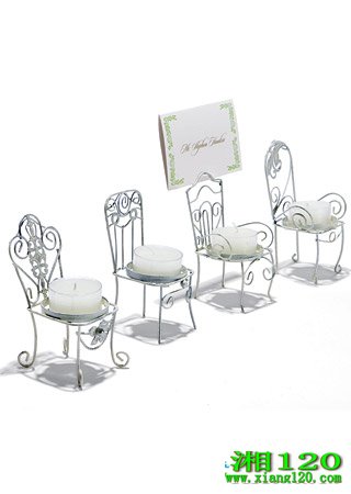 白色铁艺座椅席位卡是很好的摆设品,四种不同的款式各有特色。可别以为它只有放置席位卡一种作用,你还能将蜡烛放在它的椅面上,以便烛光仪式的时候点燃。