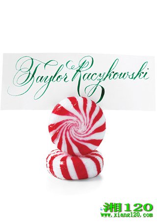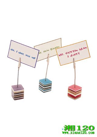 这款色彩缤纷的席位卡支架可不是糖果做的,它是由彩色塑胶制成的。尽管它外形简单,但色彩却十分艳丽,是最佳的装饰用品。除了用来夹席位卡,你还可以将它当做名片夹放在办公桌上。