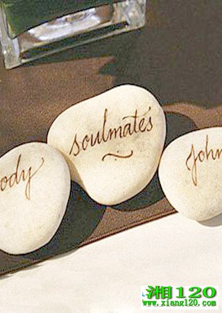 国外早就有新人采用这种做法,这个创意是来源于神话中的魔符石,人们深信刻画着古代密文的石头能够带来好运。石头席位卡的制作方法很简单,你只需要去花鸟市场采购一些鹅卵石,或者干脆去海滩边拣一点回来,这样,你连一分钱都不用花费。,在石头上写字可不太容易,外国人使用的是具有粘性且不易化开的枫糖浆。