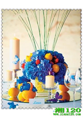 秋日里能够装点婚礼的备选水果很多,柠檬、橙子、金橘、石榴、青苹果等,都是色彩鲜艳又比较耐放的选择。如果希望婚礼整体感觉明快清新又充满活力,可以用橙色系水果搭配绿色系或者是蓝色系花材;如果希望让婚礼充满丰收的愉悦感,偏红色系的水果就是很好的设计元素。如果预算比较宽裕,树莓之类的浆果也是婚礼中很好的选择,紫色系能够将婚礼的优雅很好地展现出来。