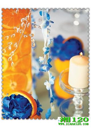 细节制胜,这是不变的硬道理。用精心挑选的甜橙作为花器,搭配简约的花艺设计,就能体现出独到的用心。主桌花花艺的设计中,在精美的丝带上黏贴上小小的花瓣和鲜花装饰,既很好地平衡了高挑花器产生的距离感,也为整个设计平添了优雅气质。而更能吸引眼球的就是花器的装饰了,除了将大量水果叠加在一起作为花托,何不创新想法,用一片片鲜橙将花器全部填满,新鲜欲滴的橙香会让来宾不禁为这个又美观又细腻的装饰拍手叫好的。