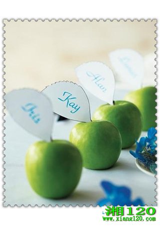 看似平常的桌卡,如果用心设计,其实也能令来宾感动不已。呼应水果主题,选择外观精巧可爱的青苹果,加上特别设计的名卡,清新雅致,就是一份送给来宾的小礼物。