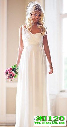 四。孕妇新娘最好选择平底鞋,搭配单肩或者无肩的婚纱,一样会让你显得高挑。