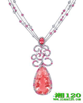 帕拉依巴蓝碧玺是一种珍贵的具有圣洁的婚饰,这款项链给人的感觉很喜庆,很大方典雅的设计加上明媚柔和的红色,将新娘的颈间衬托的很优雅。