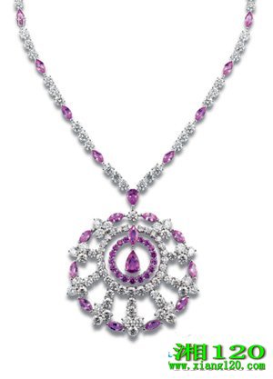 这款项链所含的寓意是代表着圆满幸福,红色的钻石与白色的钻石相互搭配,最里面一圈的红色钻石组成圆环让这款项链看上去给人一种很柔美的感觉。