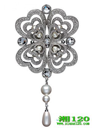 这款珍珠胸针由四部分桃心形状镶上小粒的钻石而组成,由小粒钻石镶嵌而成的众多小桃心呈不规则的形状分布,尾部的珍珠呈水滴形状,珍珠的圆润在繁复的铂金外围的点缀下显得更加的优雅。这款胸针若是搭配白色的礼服能让新娘显得气质迷人。