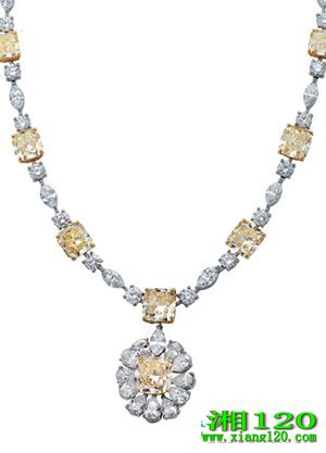 钻石零散的镶嵌在由铂金组成的项链里,小颗粒的钻石镶嵌在铂金里面与中间的黄色圆环钻石组成一朵花的设计,这款新娘项链给人一种很高贵的奢华气息。