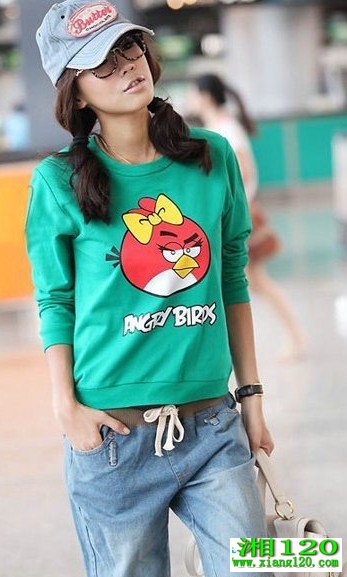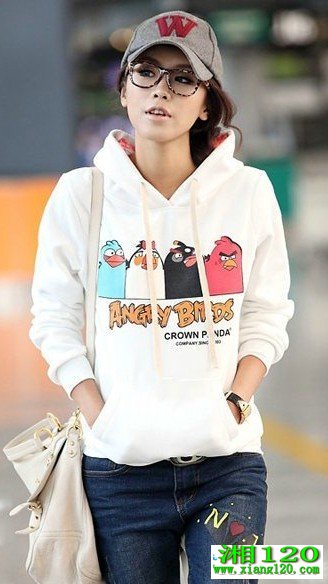 印花拼色连帽卫衣套装,充满了韩国休闲味道的卫衣 ;纯净的底色运用最热门游戏愤怒的小鸟的小鸟印花的手法,与时俱进!干净的颜色特别适合秋季。