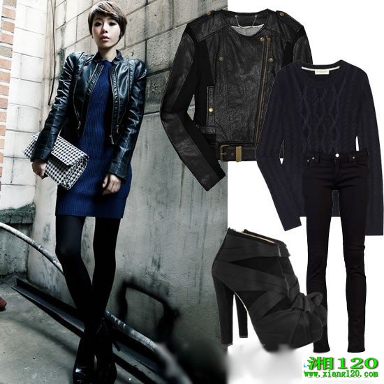 女孩扮帅,中性风走起来,深蓝色的复古毛衣搭配黑色的机车皮衣和铅笔裤,利索大气。