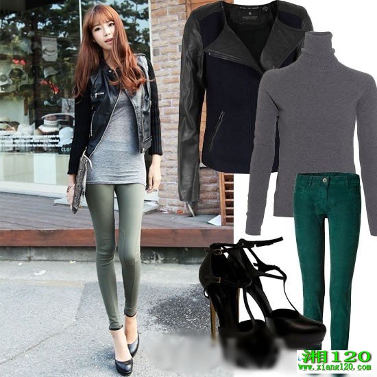 夏日已过,穿衣也要更有色彩感,黑色皮衣和锥形休闲裤搭上亮色的针织衫和银光粉的短靴,整体组合绝对够Fashion。