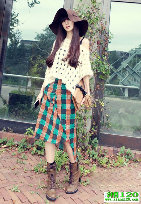 圆领花纹保暖针织衫+性感高贵半身皮质裙