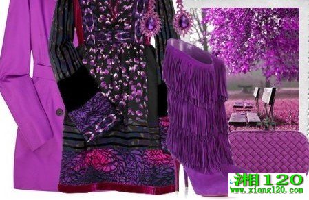 高贵紫:落英缤纷的秋季,紫色无疑是最高贵神秘的色彩,印花长裙散发撩人风姿,流苏长靴又增添了几分洒脱不羁,精致剪裁的风衣是这个季节的必备款,小巧的编织手拿包,怎是一个精致了得。