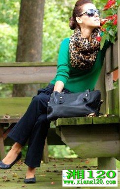 豹纹单品的热度还在持续,稍不留意就有可能落入俗套。果绿色针织衫搭配豹纹围巾,新颖且和谐,即使下身是简单的牛仔裤,也足以出挑养眼了。
