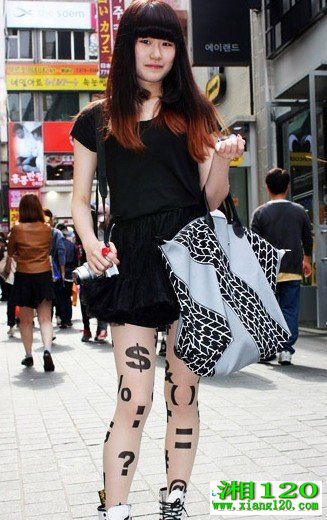 黑色的连身短裤本来很平常无奇,搭配一条写满符号的丝袜和白色的大头皮鞋,就立刻时尚起来,再配上个性图案的浅蓝色大提包,酷味儿十足。