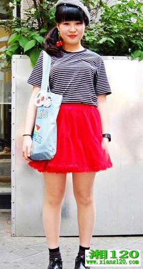 黑白条纹的水手风T恤,亮丽的,搭配一双漆皮厚底鞋,很可爱的甜美小潮女,小小的帽子,时尚又个性。