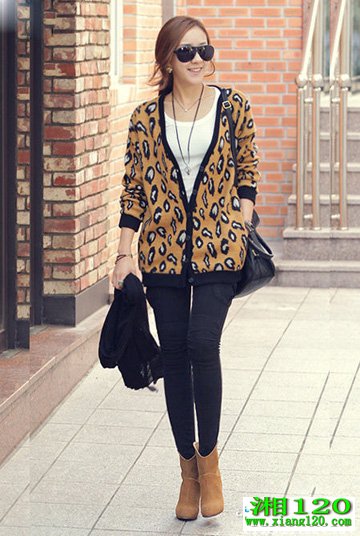 豹纹图案抢眼度满分,简约大方的针织开衫在秋日可以与众多单品搭配出时髦感。V领造型,彰显性感魅力气质,修身的款式依然十分时尚。