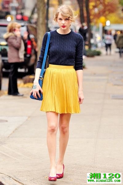 深蓝色扭花毛衣搭配亮黄色百褶裙,最关键的是这个蓝色挎包,颜色不偏不倚,恰到好处。