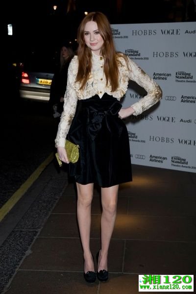 金色印花衬衣搭配天鹅绒短裙,黄色蟒蛇纹理手包,Karen Gillan简直美翻了。这一季天鹅绒材质的衣服可是重点哦,看的小编心动不已。