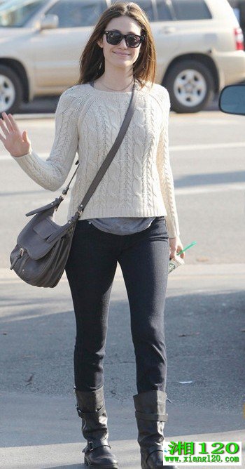 白色套头毛衣是更为百搭实用的设计,麻花扭花纹的设计给整个毛衣增添甜美感,配搭黑色牛仔裤、黑色斜挎包和黑色机车靴。