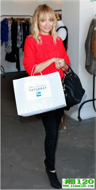 红色套头针织衫绝对是冬日最大的亮眼毛衣,搭配黑色牛仔裤是最快出门的实用搭配,黑色手提包和裸靴是这套搭配的时尚小亮点。