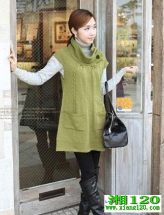 冬季,各种纯色的高领毛衣是搭配必备的单品,在这一身搭配中,运用灰色的高领毛衣搭配绿色的背心连衣裙,展现出简约优雅的风格,而黑色裤袜和长靴的搭配,也有拉长腿部线条的作用,让身材显得更加高挑苗条。配以精致的发型与妆容,加上一个时尚的黑色包包,给人一种落落大方的感觉,这样的搭配很适合轻熟女。