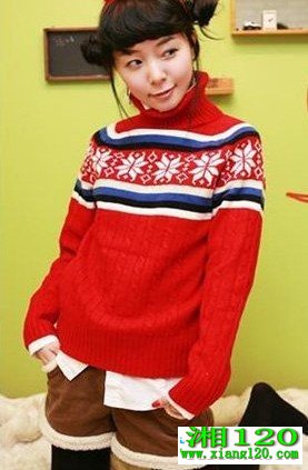 红色的高领毛衣让冬天也充满了缤纷亮丽的色彩,内搭一件白色衬衫增加层次感,加上驼色的短裤,极有圣诞气氛。