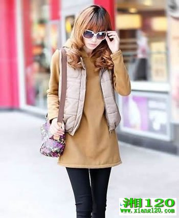 马甲虽然是休闲款式,但一样可以穿着上班与通勤。驼色连帽卫衣外套罩上一件浅色的马甲,可以有显瘦的效果。