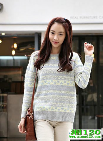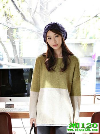 简约的拼色款毛衣,很漂亮,也很靓丽。宽松的板式,可以内搭衬衫穿噢!紧身裤或小脚裤与之搭配都是今年流行的风格。