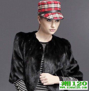 水貂毛的皮草外套,华丽不臃肿,内搭配条纹针织衫,再搭配一顶英伦风的格子帽,帅气十足。