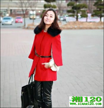 新年到,一件红色的外套能给人带来好心情,也觉得喜庆了不少,有腰带的设计不会显得臃肿,搭配一条黑色皮裤,时尚又显高。