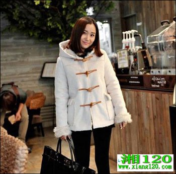 白色学院风连帽外套,配色的扣子为白色外套增加活力,与驼色的雪地鞋时尚呼应,一个休闲款的大包包,很显潮味。
