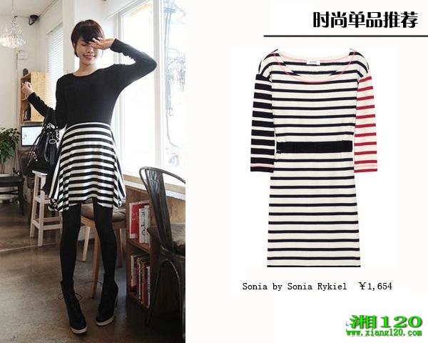 半黑半条纹的拼接让上下身看上去十分分明,横条纹的图案在两侧下垂裙摆的带动下反而在视觉上起到收缩的效果。上半身的款式非常百搭,只要套上一件针织开衫就能打造出完美出行装。