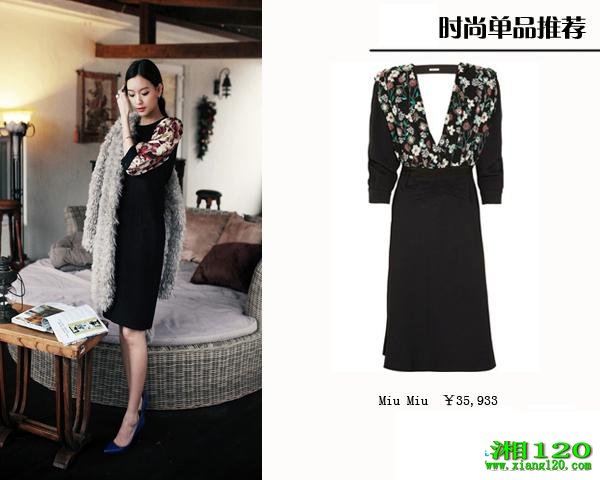 中长款的黑色圆领裙中接入性感的丝绸印花袖,将女人的风韵一显无疑。直筒裙的设计可以掩盖身材的缺陷,整体看去十分端庄,复古气息也很浓。