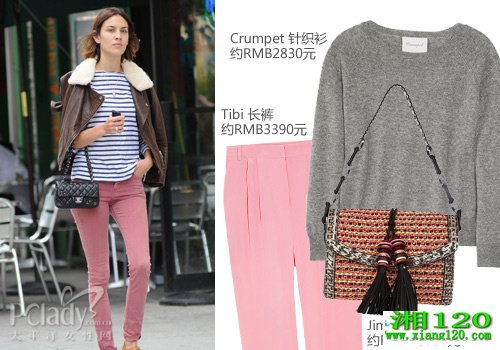 帅气的飞行员夹克,借由条纹衫的搭配而呈现出活泼俏皮的气息,酸莓色的牛仔裤更像是酸奶味冰淇淋,让着装率性洒脱的不失青春色彩。