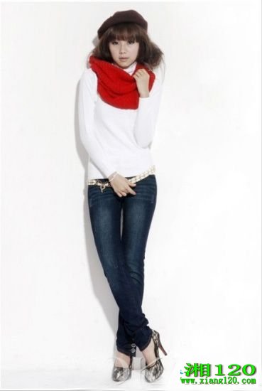 白色的毛衣往往会给人显胖的错觉,其实只要轻松搭上条围巾这一情况就可以避免,选用红色的围巾,抢眼的颜色给把整体的亮点锁定在脖子上,同样毛线质地的围巾堆起来显得也十分自然,搭上条仔裤修身又好看,再也不用为白色显胖的问题而烦恼。