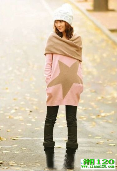 简单好搭的甜美系装扮,可爱的粉红毛衣上带有很大的五角星图案,选用同色的脖套围在肩上形成披肩的效果,层次感也很强,搭上双可爱甜美的小皮靴很修饰腿型。