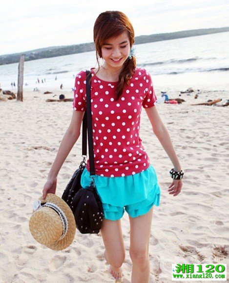 波点永远是时尚界不可缺少的设计元素,满身的波点设计,俏皮可爱,充满着青春的活力气息,橡皮红色的波点呈现一种喜庆的感觉,配上海蓝绿有层次感的短裤,阳光美少女的可爱气息一览无余。