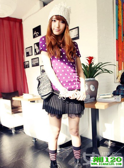 梦幻少女般清纯的紫色波点T恤,萦绕在浪漫的氛围里,鲜艳的颜色加上波点的点缀那是达到了唯美的境界,甜美系的少女搭配上一条带有的短裙,小小的性感中还散发出浪漫公主气质。