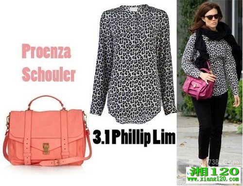 黑白色系豹纹衬衫,搭配黑色裤子与围巾,成熟稳重,配一个糖果色的包包,立即提升潮味。