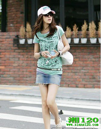 深色的牛仔裙比较显瘦,而且深蓝色也很容易搭配。上衣可以多一点休闲的味道,可爱的卡通图案T恤就是不错的选择。猫须的裙边更增添俏皮感。